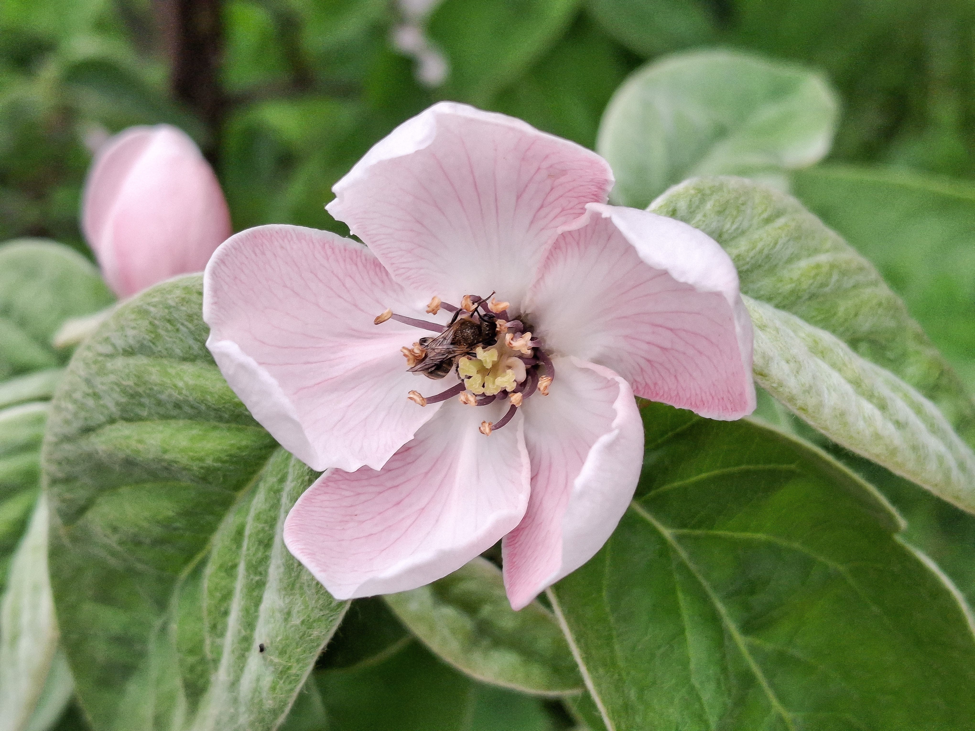 Quince's lovely fragrant flowers appear April to May, They are rich in nectar and pollen, providing valuable food for pollinators like honey bees. The Quince is self-pollinating, so more than 1 is not necessary, but cross-pollination can produce increased fruit production.
