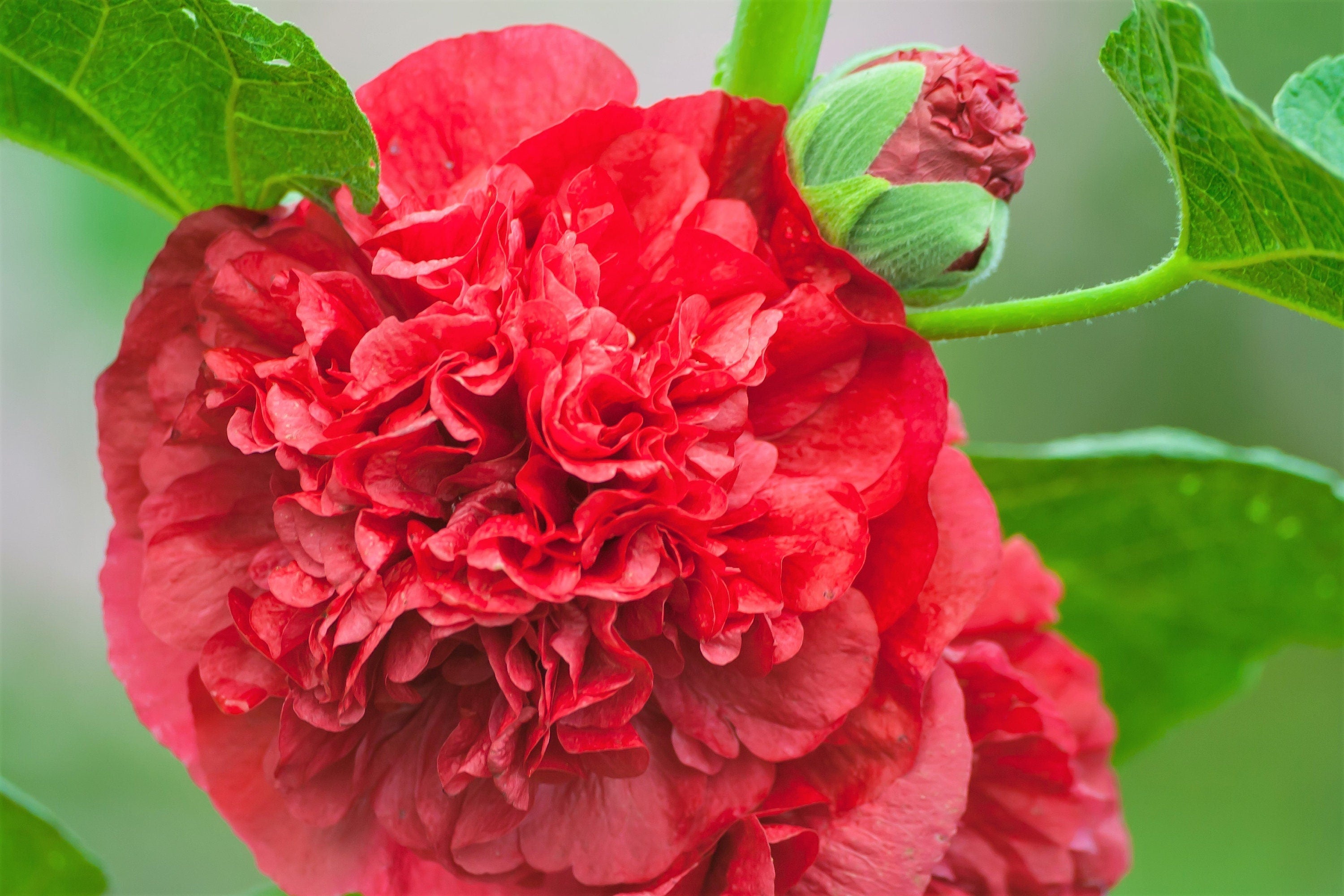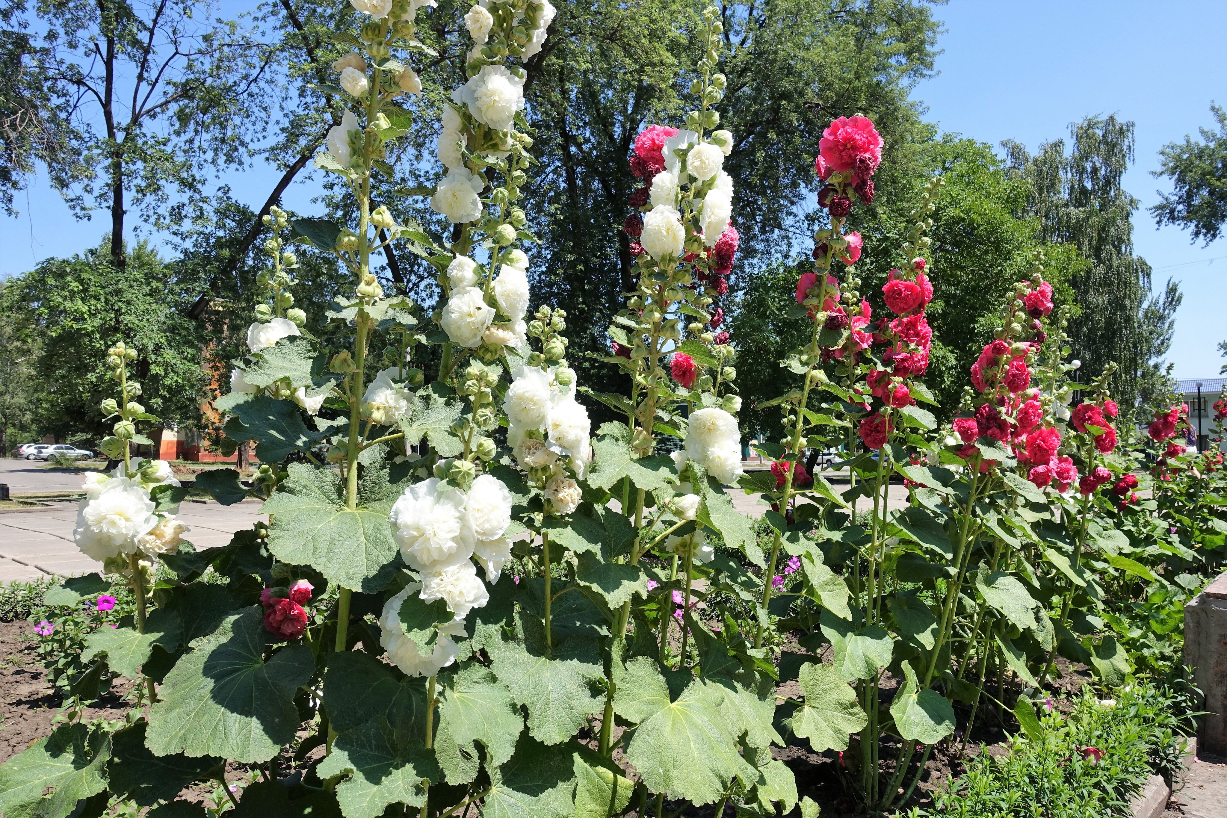 The huge 3 1/2" double flowers of Summer Carnival are extremely showy, covering the stalks top to bottom with tons of blooms in mid summer. The buds open from the bottom & work their way up to give you a nice long bloom time. Cut some to enjoy indoors, or leave them outside to share with the bees, butterflies, & HUMMINGBIRDS that will be equally delighted with their blossoms.