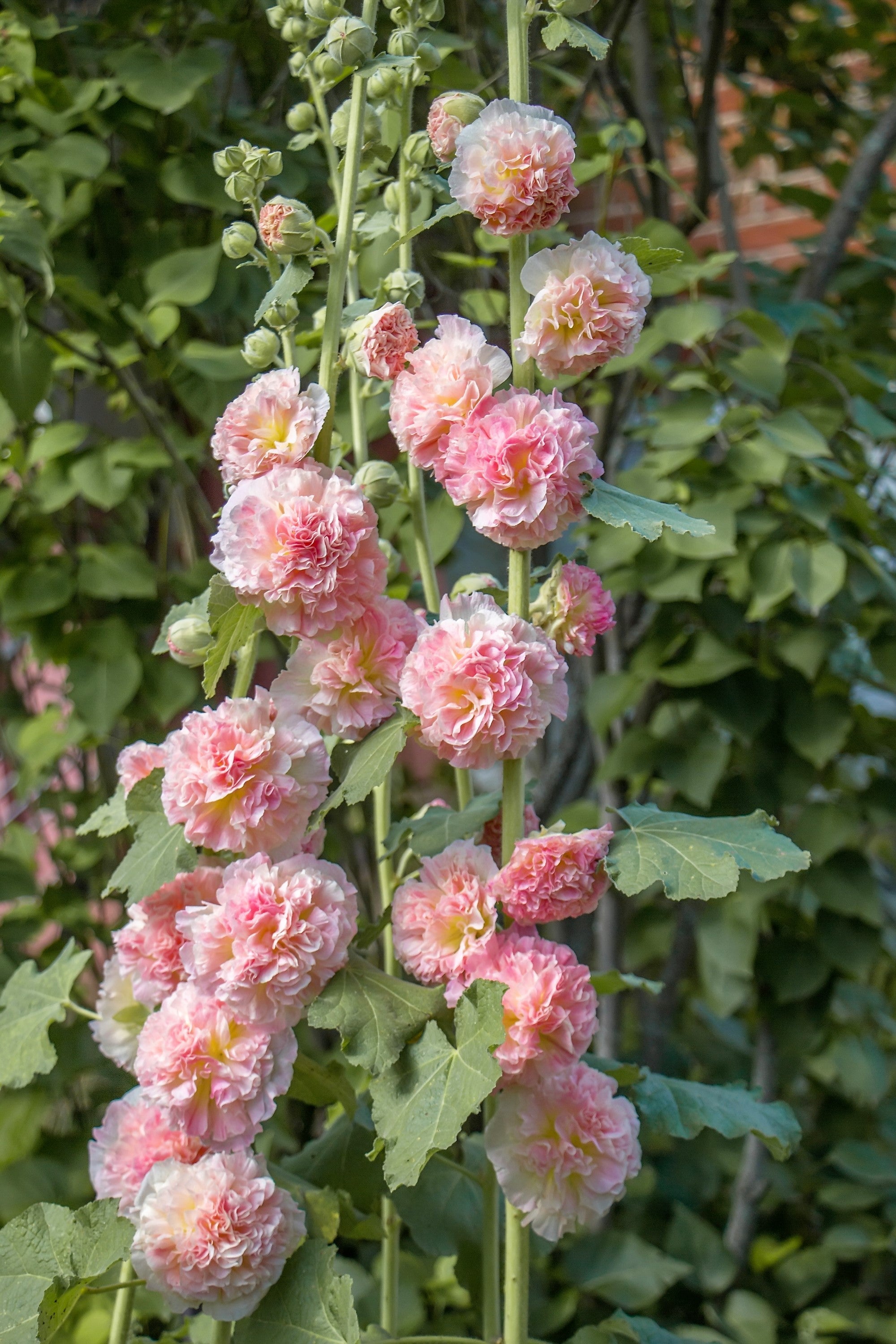 As you can see, Hollyhocks get quite tall, so they are right at home in the back row of your flower garden. Their tall upright stalks are covered from top to bottom with endless blooms in stunning shades. Every summer, I never cease to be amazed at their loveliness towering over me, and I never tire of watching the bumble bees roll around in their blooms delighting in being covered in pollen. Hollyhocks are easy to grow, grow quickly, and require basically no attention once they have taken off.