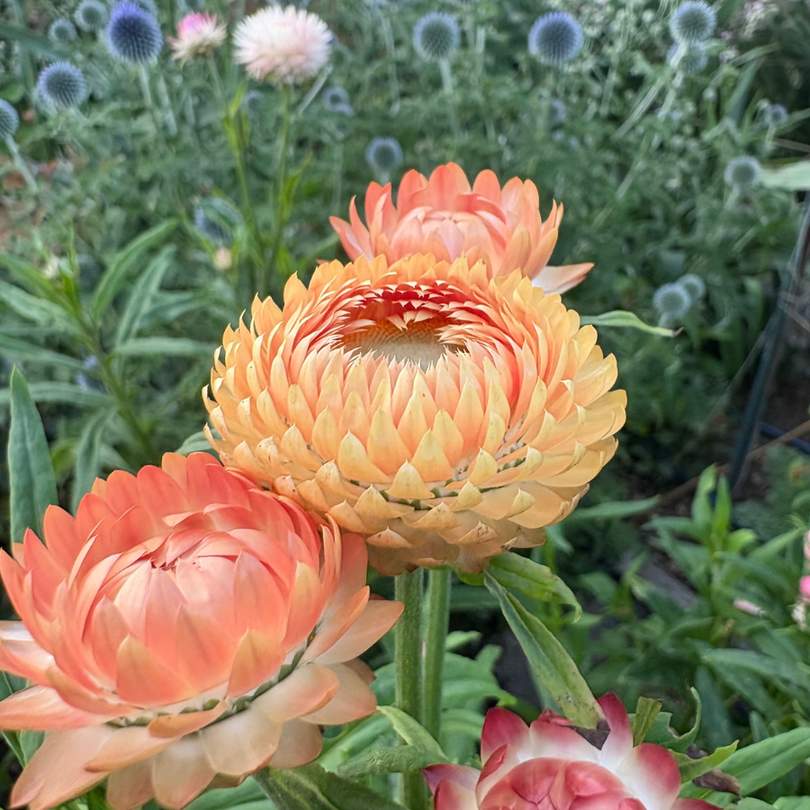 A ridiculous amount of flowers. Specifically, Dahlias, David Austin Roses, Canterbury Bells, Craspedia, Cosmos, Zinnia, Sweet peas, Eryngium, Echinops, Hydrangeas, Foxglove, Larkspur, Yarrow, Delphinium, Scabiosa, Starflower. The list goes on and varies by season.